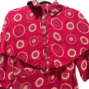 Vintage 1970s Handmade Couture Maxi Dress. Red sheer fabric with gold medallion print. Side zip and snap. Button front (one button appears to have white color on it.) The stitching of the waist fabric is loose in spots, otherwise in great condition. Elbow length sleeves. Looks amazing on. The cape detail drapes nicely over the chest and the back, very elegant. Gunne Sax inspired. Made with great detail. Is pretty sheer. Photos cannot do this dress justice.
