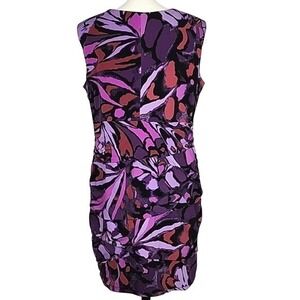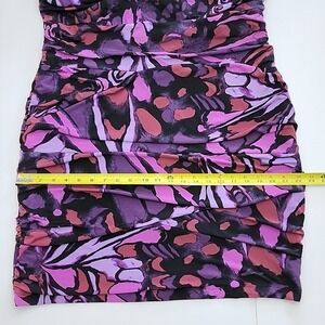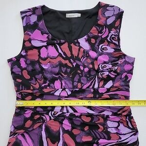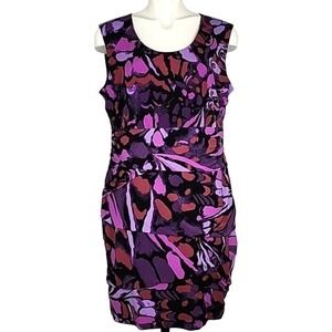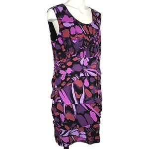 Excellent pre-owned condition, elegant and versatile Ricki's sleeveless tiered, lined, sleeveless sheath dress in varied purple motifs with black detailing in a drapy stretch material and slight, flattering rusched tapering at the waistline, size XL.