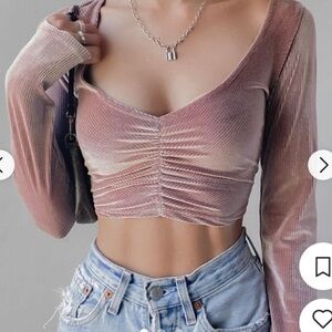 Rose Gold, Ribbed, Long Sleeve Crop Top. Stretchy, Soft Fabric with V Neck and Ruching at the Center. Women’s Size Medium. EUC.
