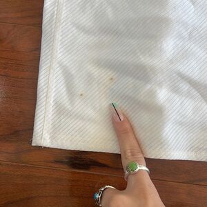There are a couple of small stains on the back bottom of dress. Please see last photos. The size tag is missing, however, I believe it is a size 8. Straps are adjustable!