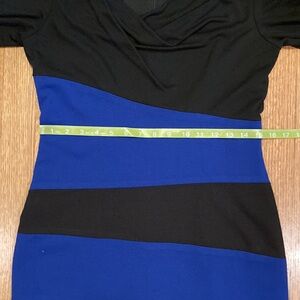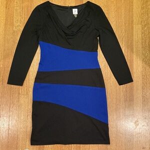 Beautiful fit and fabric with stretch, lined, back zipper, cowl neckline, long sleeve, 37 inch length, 18 inches pit to pit, 15 inch waist, 19 inch hips, great condition