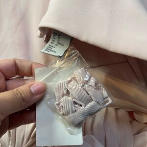 This beautiful light pink dress, fitted strapless bodice but includes straps that can be added or removed, pleated drop waist skirt.