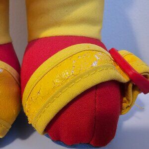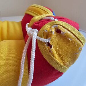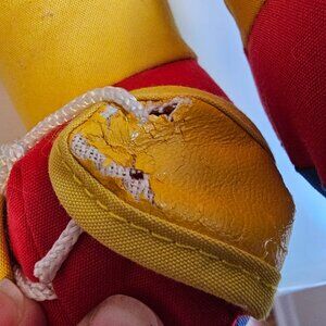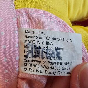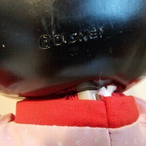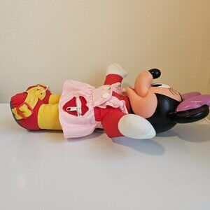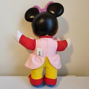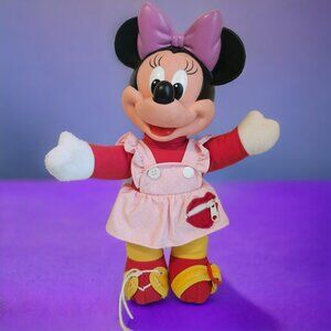 Pre-owned Mattel Disney Minnie Mouse Learn To Dress doll. Has a stuffed/cloth body and a rubber face. Measures approx. 14" tall. In fair pre-owned condition. Noted flaws: wear to pleather material on both shoes, light amount of scribbles on inside of mouth, some minor discoloration to hands, handwriting on tush tag. Lovely addition for a vintage Disney collection. Ships from a smoke-free home.