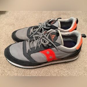 Hoka Challenger in a grey, citrus, & coral colorway.