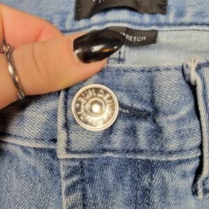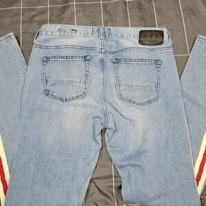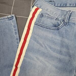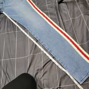 Excellent preowned condition. No hole stains or tears. light washed denim with red and white racing stripes going down the outside pant leg. size is 30x32 and style is the Skinny comfort stretch