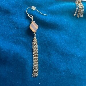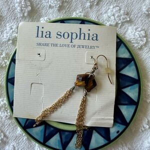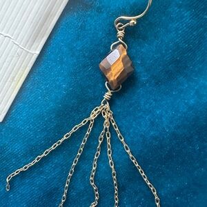 NWOT; never worn. Pierced dangle earrings. Gold toned with a variation of rich, wood-like diamond-shaped pendant. Measures approximately two inches long. Dangle consists of five gold dainty chains.