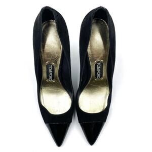 SOLD-Tom Ford Suede Pumps Black Patent Cap Toe Stiletto Heels Point Toe