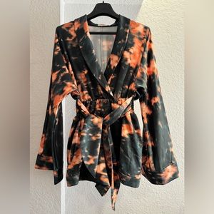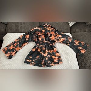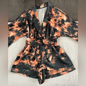 Camila Coelho Amelia Romper in Orange Teal Tie Dye Black XS Satin Kimono Sleeve