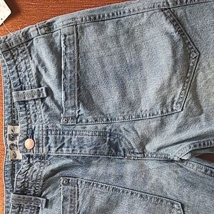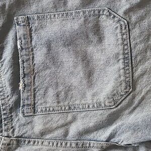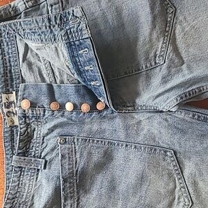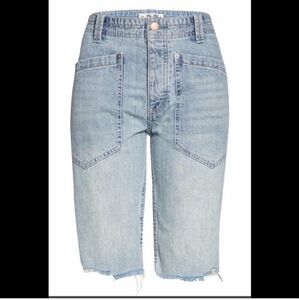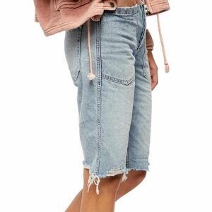 Brand new with tags Free People denim bermuda shorts. Features high rise long line silhouette with exaggerated pockets, raw bottom hem line, deep front patch pockets, patch pockets on rear, and brass button fly closure.