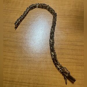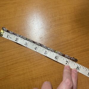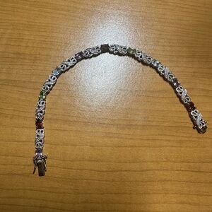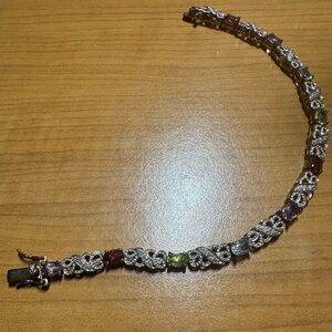 Sterling Silver Gemstone tennis bracelet, hallmarked 925. Is silver and gold in color. Different colored gemstones. Measures 7.25" long. Happy to bundle with other listings. Same day or next day shipping! I do cross post everything on multiple sites, so get it while you can! Because I list everything on multiple platforms, all sales are final, no returns.