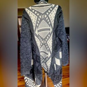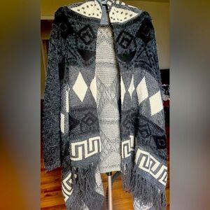 Black, gray, and light beige design wool sweater. Long in front and shorter in back.