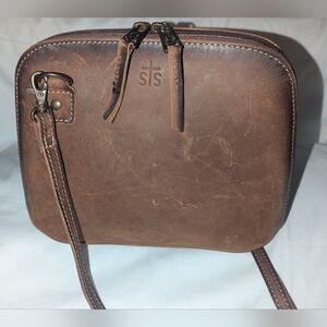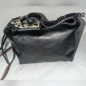 Simple design in strong yet light weight leather shoulder/crossbody bag. Efficient and funtional with zipper closure two open pockets on front and one zip pocket on back. Adjustable crossbody strap. It is rare. One zip pocket inside and 3 slip pockets and 3 pen slots inside. Bag is in very good pre-owned condition. Two marks on back corner as shown in the picture. 14"-13.5"-2.25"