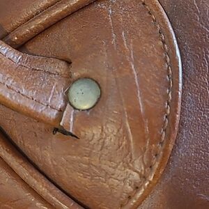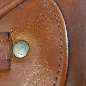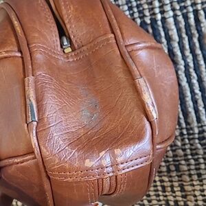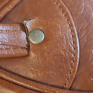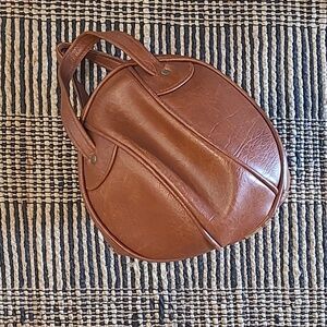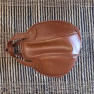 Unique Sphere Round Shape Leather Bowling Ball Bag. Cognac Brown. Height (with handles) 14in. Width 11.5in. There are signs of wear on the handles and bottom of the purse. Other than that, this bag is in good vintage condition.