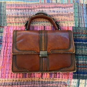 no tags or brand. leather miniature hand held bag with several storage compartments. good condition with slight wear and scuff due to age.