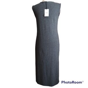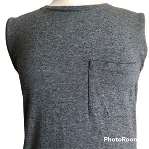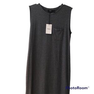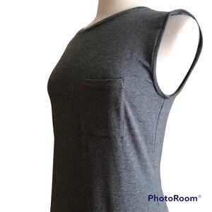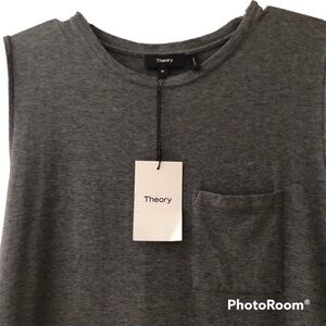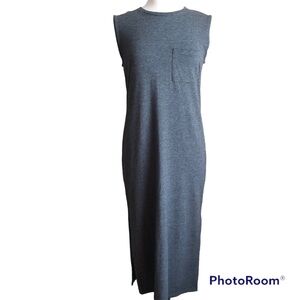 Theory Sleeveless Muscle Tee MIDI Dress. Grey. Casual contemporary silhouette. Ranmire knit of Model and Peruvian Pima Cotton. Stretch. Soft and airy. 12” side split hem. Chest patch pocket. Approximate measurements: Underarm to Underarm 18”, Shoulder to Hem 46”. EUC worn once.
