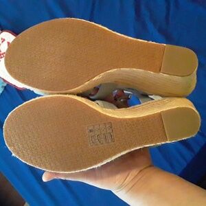 brand spanking new! never been worn! light blue in color with a super cute silver zipper on front for easy in and out of the shoe. 4 inch wedge heel. no box. made in Cambodia. textile upper, textile outsole. size 10