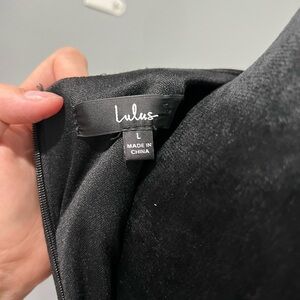 Size Large. Color is black. It is 35 inches from shoulder to bottom of dress.