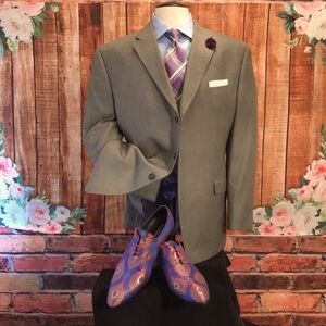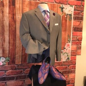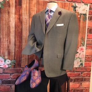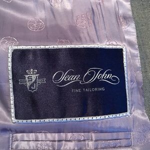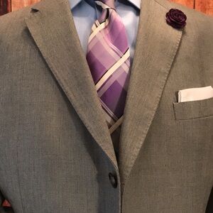 Selling this elegant Sean John Coat size 46 Regular color Silver gray only worn once it’s polyester Rayon lightweight fabric all year around perfect for business, formal occasions, Casual wear, fully lined notched pick stitch Lapel 3 buttons Front flap pick stitch pockets and Side Vents from the Back. Armpit 25 sleeves length 25 coat length 31.5 shoulder 21 accessories and shoes Not included Only the Coat. Mens Wearhouse price $299