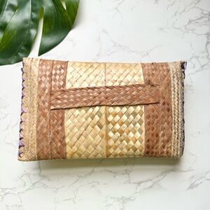 Great for a coastal beach spring summer boho bohemian vacation styled closet! This vintage Straw Woven Oversized Clutch features two tones of raffia straw weave and purple ribbon floral rose rosette accents. Has a horizontal handle strap on the back side. Big oversized size is more than enough space to hold your phone, wallet and more. One snap button closure. Some minor wear but overall in good used condition.