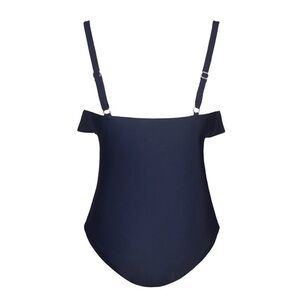 Maillot swimsuit in Navy Blue. Ruffle detail at the chest and ruched through front of the body. Light removable padding. Adjustable shoulder straps.