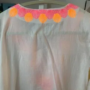 Pink and orange embroidery featured around the neckline and down the front of the top