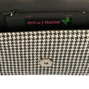 Vintage PUTU BY J. MacLear Houndstooth Clutch, Polished Silver-tone Hardware, Magnetic Snap Closure, Black Skinny Leather Strap, Black Lining, Zip Interior Pocket.