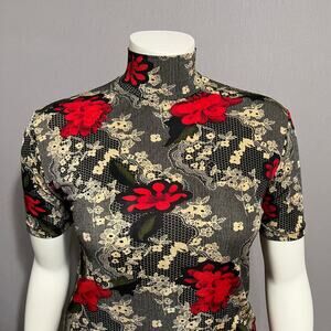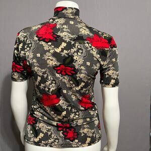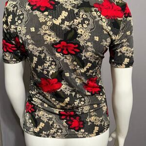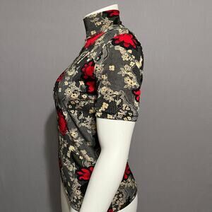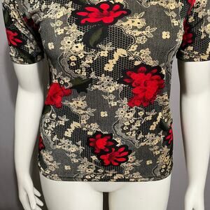 Susan Lawrence Cherry Red Floral Knit Romantic Short Sleeve Top Sz-Medium