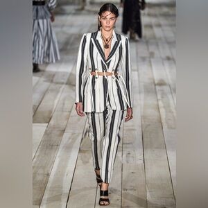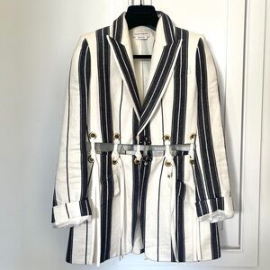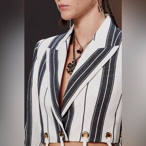 This jacket’s unique combination of stripes and eyelet details makes it versatile for both formal and casual settings. Pairing it with neutral trousers or skirts can highlight its design elements, while layering over a simple top can make it the statement piece of an ensemble.