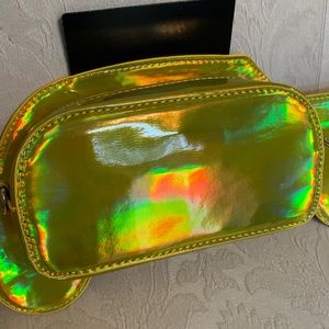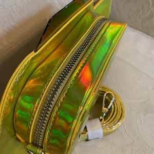 Adorable taxi shaped bag in a gold iridescent holographic vegan patent leather