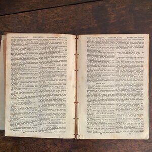 Hardcover cloth binding is embossed on front and back, original owner's nameplate inside front cover, binding is separating from the sewn pages. One signature may be missing between Job and Psalms, see photo. There is a ripped page in Exodus. Was probably a very fancy book in its day.