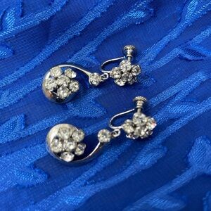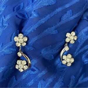 Vintage silver toned earrings with multiple clear stones. Flower pattern base with dangling flower. Screw on backs. Lightweight and approximately 1.5 inches long.