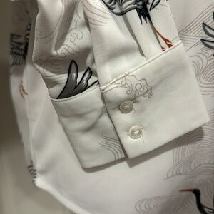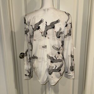 Nice and fun flying cranes V-neck long-sleeve blouse with 2 button cuff and pleated front for room and drape. 100% polyester, machine wash cold. There is a little bit of stretch to the fabric. Flattering g shirt tail hem. The color is more of a soft white. Measurements in photos. Excellent condition. No rips or stains.