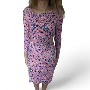 Lilly Pulitzer dress, size XS. Pink, blue and white with pineapple design. 3/4 sleeves. In good, gently used condition. Some piling. No rips, holes or stains.