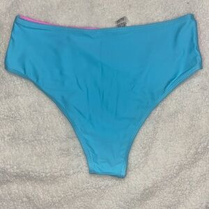 - High waisted colorblock blue, pink, and yellow bikini bottom. Never worn, hygiene liner still attached.