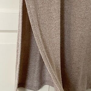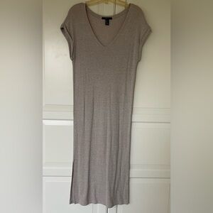 Midi/maxi dress, (refer to measurements). V-neck. Over the shoulder cuff sleeve. Side slits, both sides. Unlined. Stretch to fabric (jersey like)