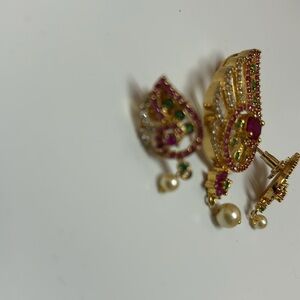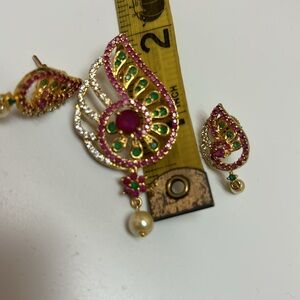 Indian jewlry Earrings and pendant set in gold with pink, green stone and pearl. Can pair with any plain gold chain. Small size earrings. Please check approximately size measurements in pictures. Indian Pakistani wear. Can go great to with saree, kurta, shalwar kameez and more. Wedding, sangeet, Eid, Diwali and more. Costume jewelry set of pendant and earrings. Please look at all pictures. This listing is as is, it’s new without tag. Please look at all pictures before purchasing. Color may look slightly different due to lighting.