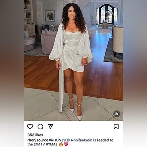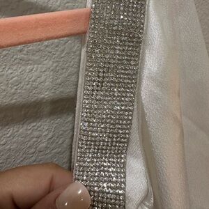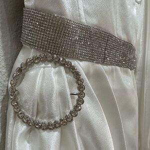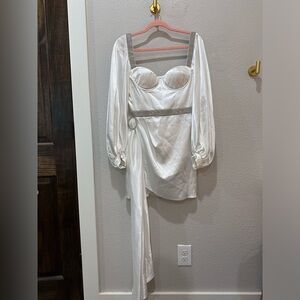 NWOT GORGEOUS white satin dress. Rhinestone accents galore. Corset boning. Inside silicone gripping for shoulders to stay put. Puff balloon sleeves.