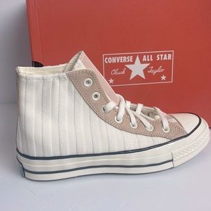 Stylish Converse high-top sneakers. Features white canvas with tan accents. Iconic design with classic logo. Only worn once, they were too big on me.