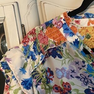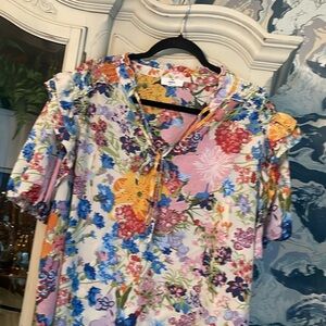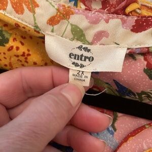 Beautiful spring top from Entro in plus size 2X. Lightweight semi sheer fabric is cream with nice bold floral. Smocked on shoulders and double row of ruffles where shoulder meets sleeve. Slight gathering on sleeves. Toes at loose neckline. Smoke free home.