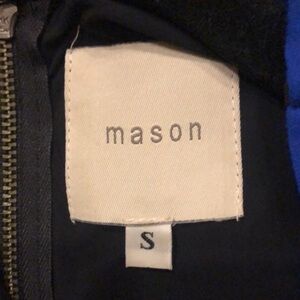 Mason quality brand sleeveless mini dress with bias cut flounce skirt. Comes above the knee with a pleather detail at the waist. Wonderful stretch and structure. Great quality! Very good condition. There is a very slight color striation on the right side fold of the skirt- looks like from an iron. See last photo. Small