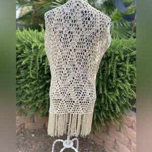 Beautiful boho crochet vest by BAJEE COLLECTION. Size SMALL, but could fit Medium or even Large as well. Neutral cream crochet with matching fringe detail. EUC.