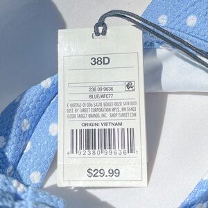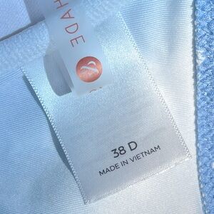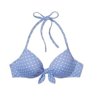 Shade & Shore Lighttly Lined Bikini Top in Blue Dot. Size 38D. New with tags. Underwire, sewn in cup. Ties at front middle. Includes Soft Cup for modesty/coverage. Hook closure & halter tie at back.