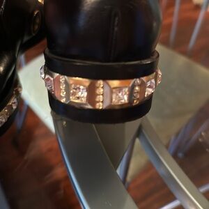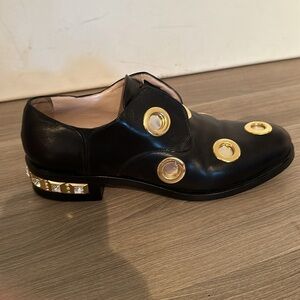Crafted from black supple leather, these truly unique Cavallini slip-on style loafers feature a rounded toe, large eye-catching gold-tone metal eyelets on the upper, an elasticated front closure, nude leather insoles and lining, and a wide block heel embellished with gold-tone hardware and crystal studs. Stunning shoes - a total statement piece!! Smoke free and pet free home.
