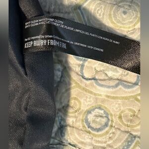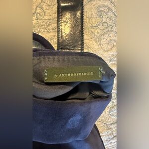 By Anthropologie . This bag is made of vegan leather and microsuede. Very beautiful blue color! One slip pocket; one zip pocket on the inside. Foldover closure. Removable guitar style strap so you can use the bag as an evening bag with the ring as the handle. Goes perfectly with a boho / bohemian chic outfit.