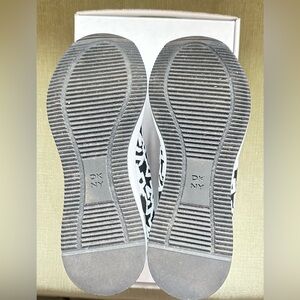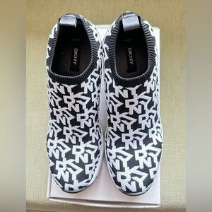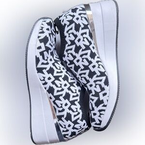 DKNY Women's Polly Wedge Slip On Sneaker Bootie Black/White Logo Print Sz.10