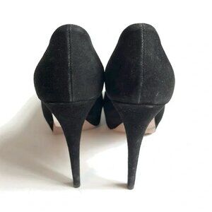 Circa 2012, these pumps from Prada are made with a Camoscio suede in a Nero black, and feature partially-covered high heels, closed almond toes, tonal stitching, and leather lining and soles.