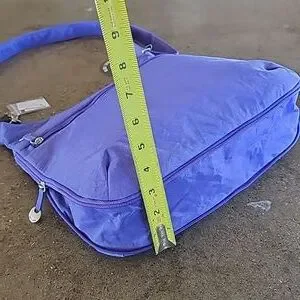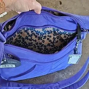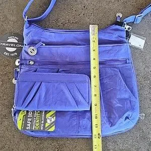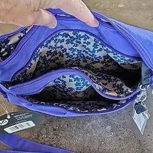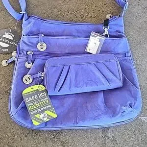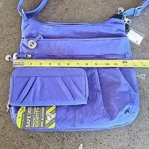 Beautiful and functional purple bag by Travelon with wallet. So versatile, zip open to expand bottom for 3" base. Strapped on mini flashlight. Tons of pockets for storage. Adjustable crossbody strap that measures from approximately 32" to 56" length side to side. Quality pewter-tone pull tabs and hardware. PLUS the wallet that offers RFID blocking and has ample card slots. The dream travel bag and NEW WITH TAGS!