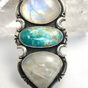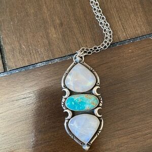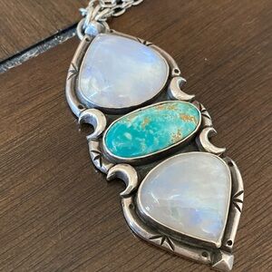 Moonstone and turquoise set in sterling silver, handmade by artist Pacific Crest Silver PCS, chain not included, pendant is 2 3/4 inches long and 1 1/8 inches wide, great condition