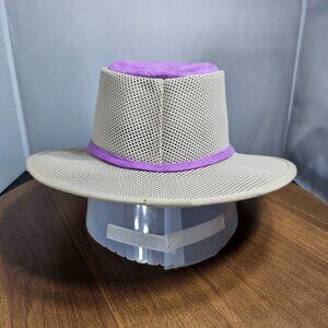 Breeze Suede Sun Hat (Alby with Suede Under the Brim) | American Hat Makers | Lilac | NWT | X-LARGE RARE COLOR The American outback-style Breeze Sun Hat is the ideal combination of a breathable mesh crown and water-repellent leather brim. It keeps you cool and dry on the hottest of days and the most demanding of adventures. Featuring a super comfortable removable sweatband liner that attaches securely with velcro tabs sewn in to the hat. Made in the USA by American Hat Makers (Head N' Home Hats) • Brim 2 3/4" • Crown 3 3/4" • Lightweight Cowhide Leather | Mesh • Water-repellent UPF 50 | Perfect Sun Hat • Removable sweatband liner, soft and comfortable • Made in the US • 100% Suede This listing is for a size X-Large. (Hat size: 7 5/8 or Head Measurement of 23 5/8 - 24 1/4") Please check the sizing image before ordering. Check other listings for other sizes and colors if available. Leather is distressed on all hats. (See Pictures and Video) This hat is new and retails for $137 (Not available in this color anymore!)
