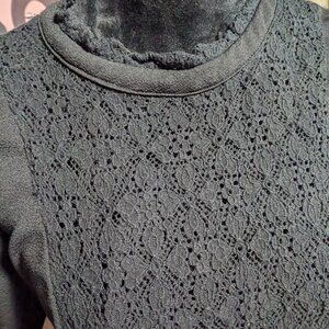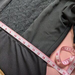 Pockets/Details: lace paneled bodice (lined from bust down/sheer at upper chest), bell sleeve, button closure at back neck, lace trimmed neckline, no pockets
